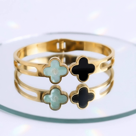 Stunning clover-shaped (quatrefoil) charms, gold-toned bangle bracelet