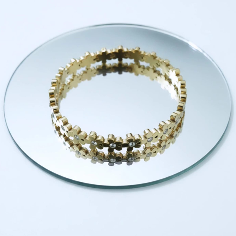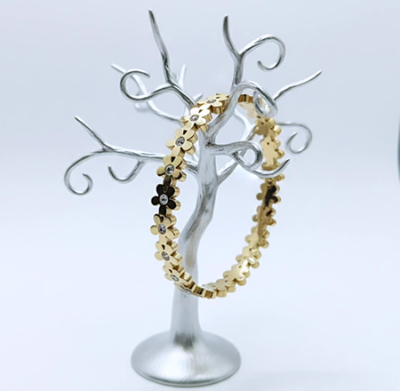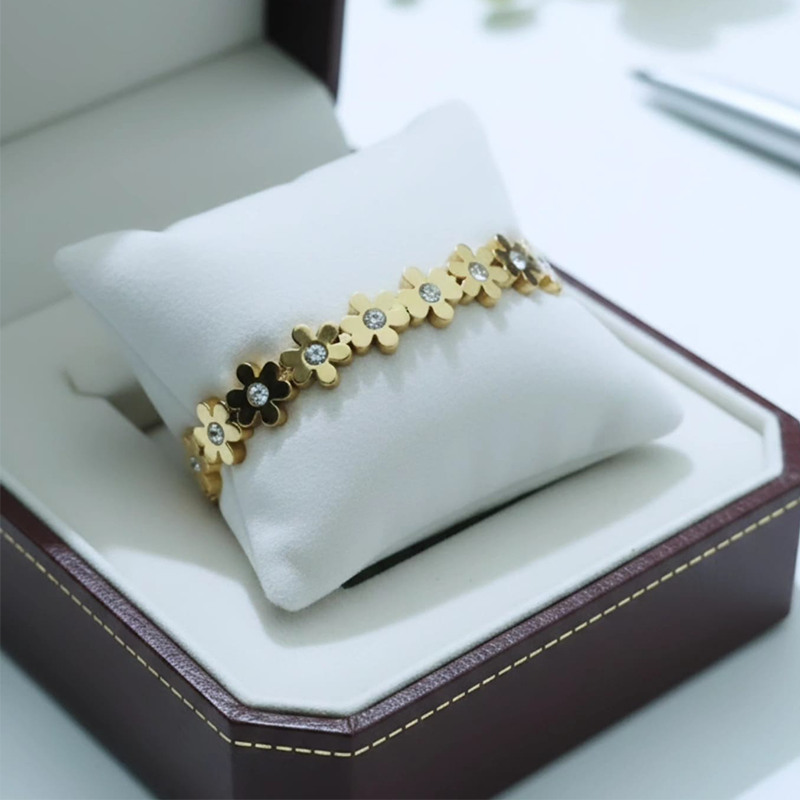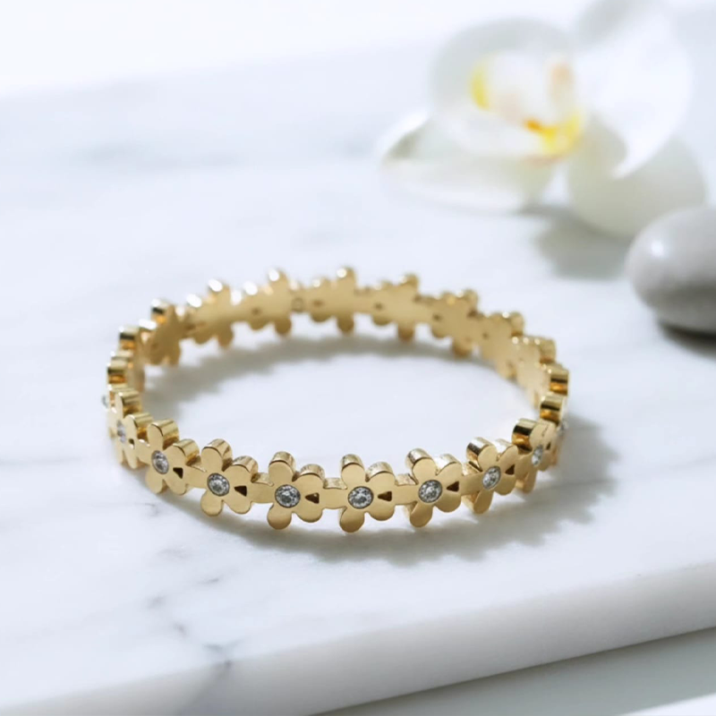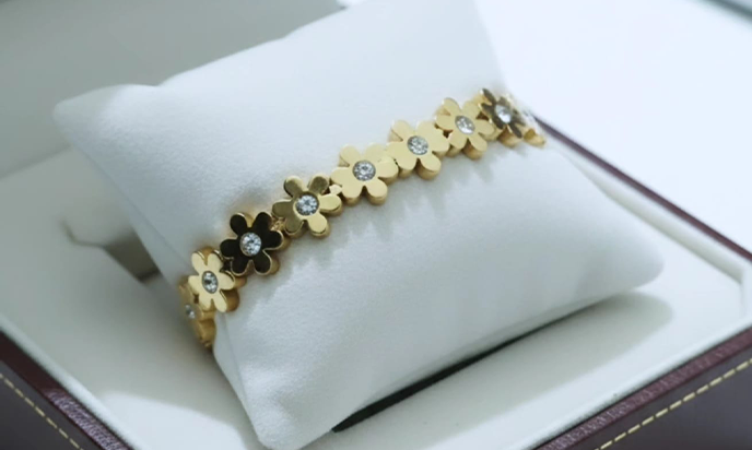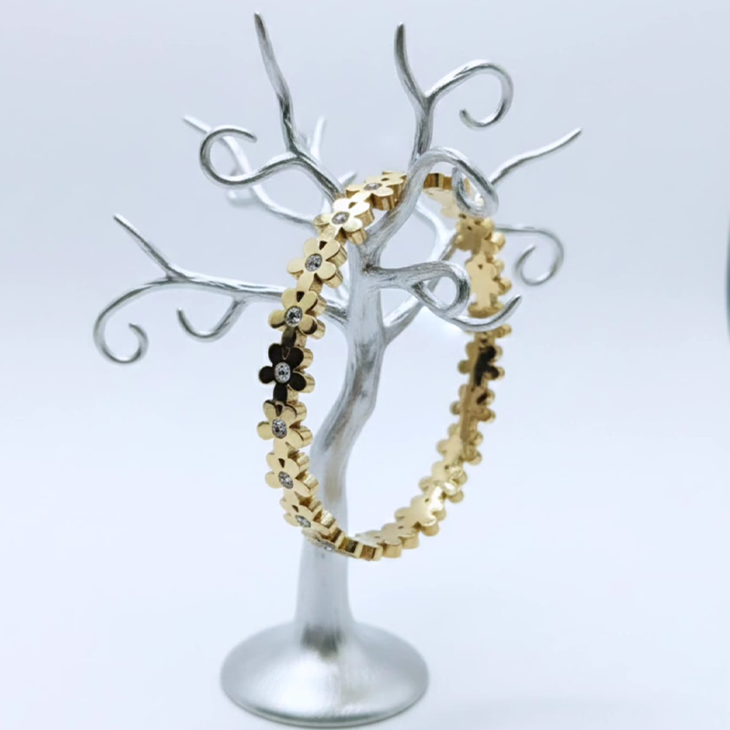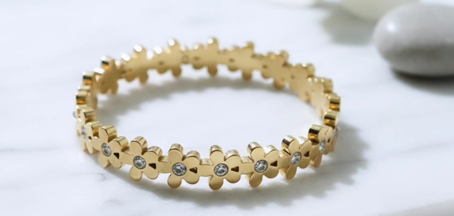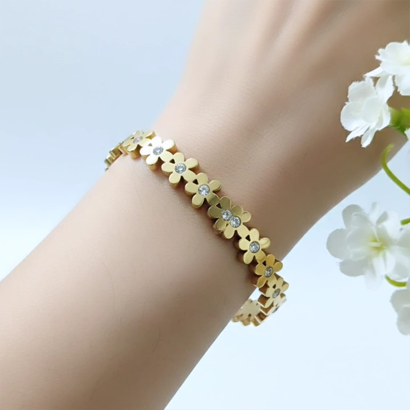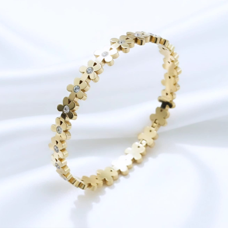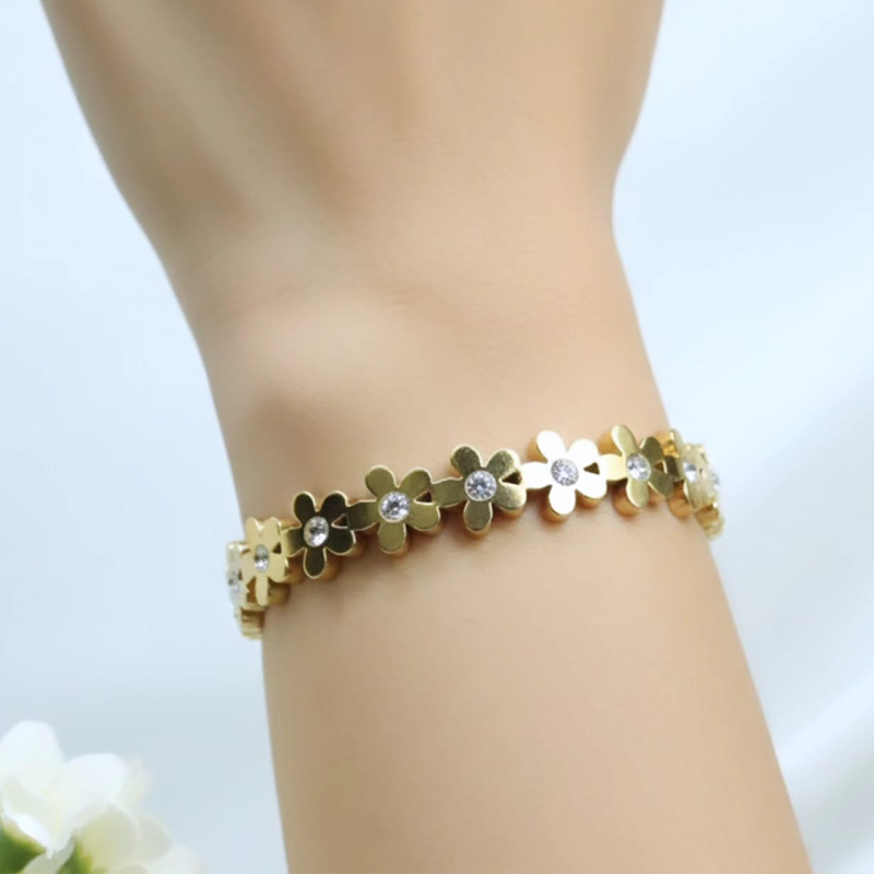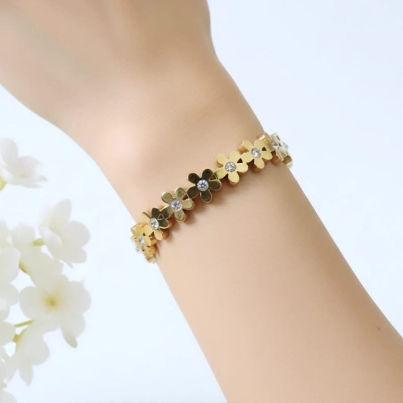 Steel Bracelet Designed with delicate five-petaled flower accents, the bracelet beautifully blends modern minimalism with timeless elegance. Its polished gold finish gives a luxurious look while the sturdy stainless steel base ensures long-lasting shine and durability