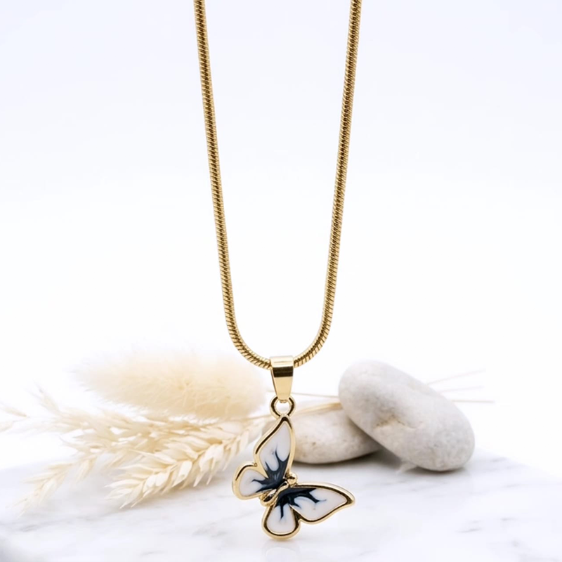 The butterfly wings are adorned with smooth enamel coating, adding a refined touch of color and shine. The enamel finish enhances the overall design, giving the pendant a graceful and artistic appearance.
