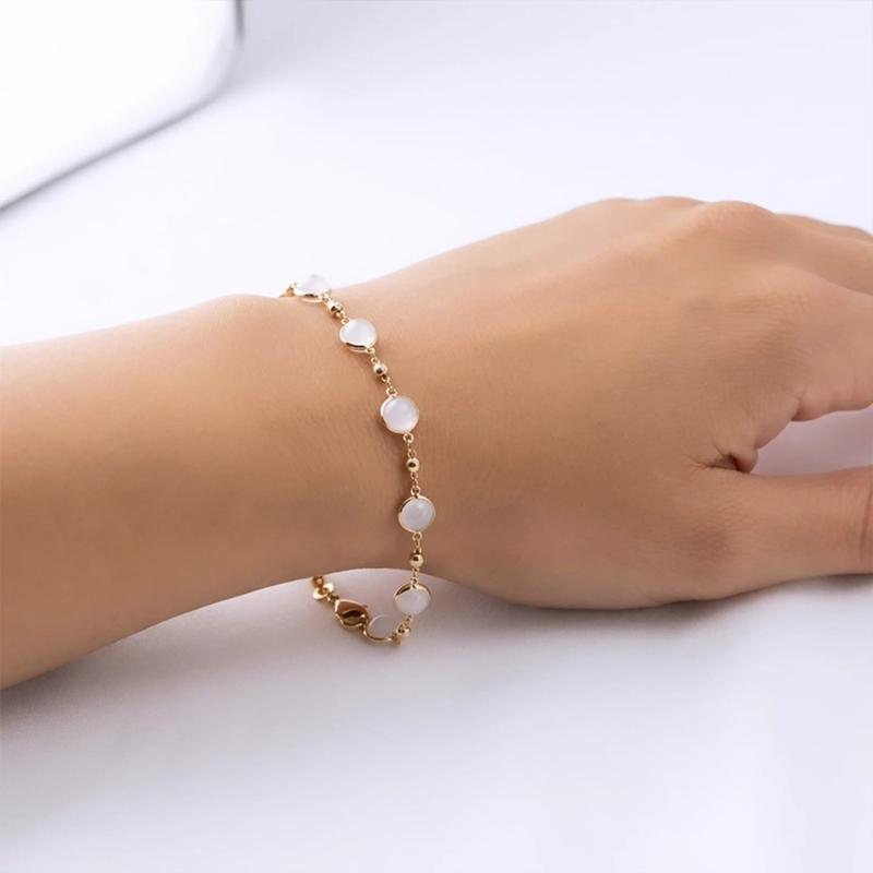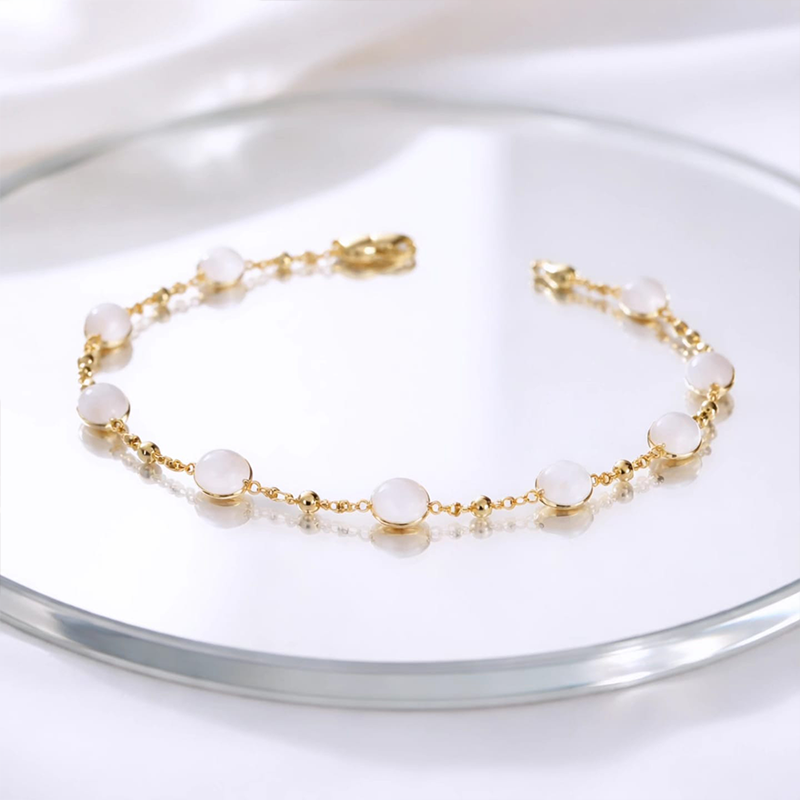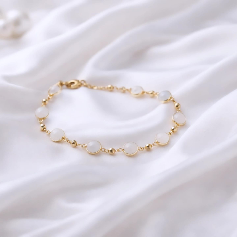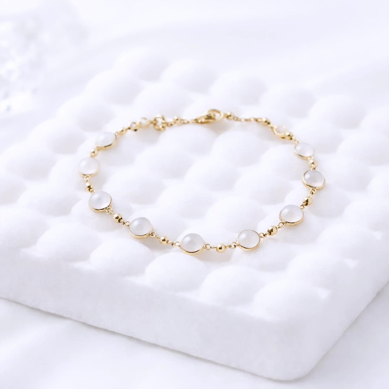 This divine bracelet features a sophisticated station-style design where each moonstone is carefully spaced along the chain to create a balanced and refined look. The evenly placed stones enhance the bracelet’s elegance while giving it a delicate and airy appearance. This design allows each stone to stand out beautifully, making the bracelet a subtle yet eye-catching accessory.