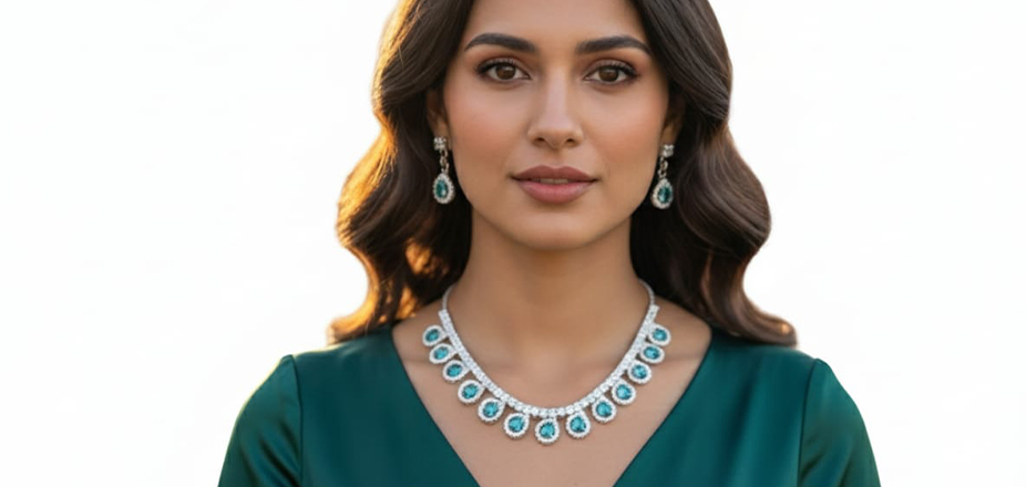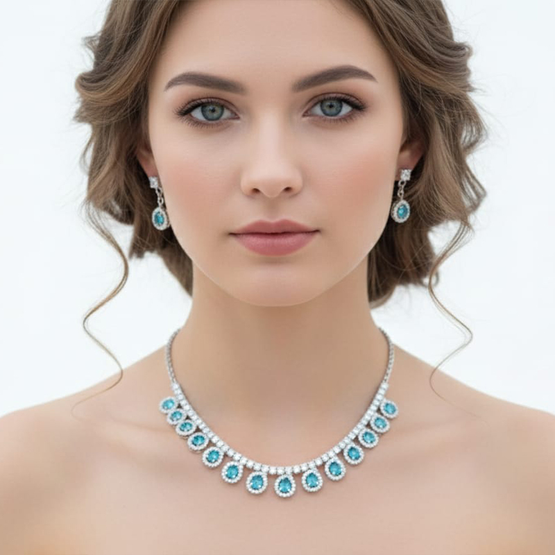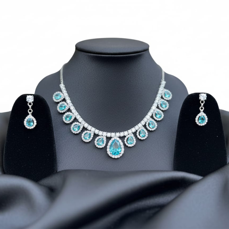 Elevate your style with this elegant silver-toned necklace and earring set, beautifully designed to make a refined statement. The set features shimmering sky blue diamond-cut stones set in high-quality silver-toned metal, creating a radiant combination of sparkle and sophistication. The necklace showcases a graceful arrangement of stones that catch the light from every angle, giving your neckline a luxurious, eye-catching glow.