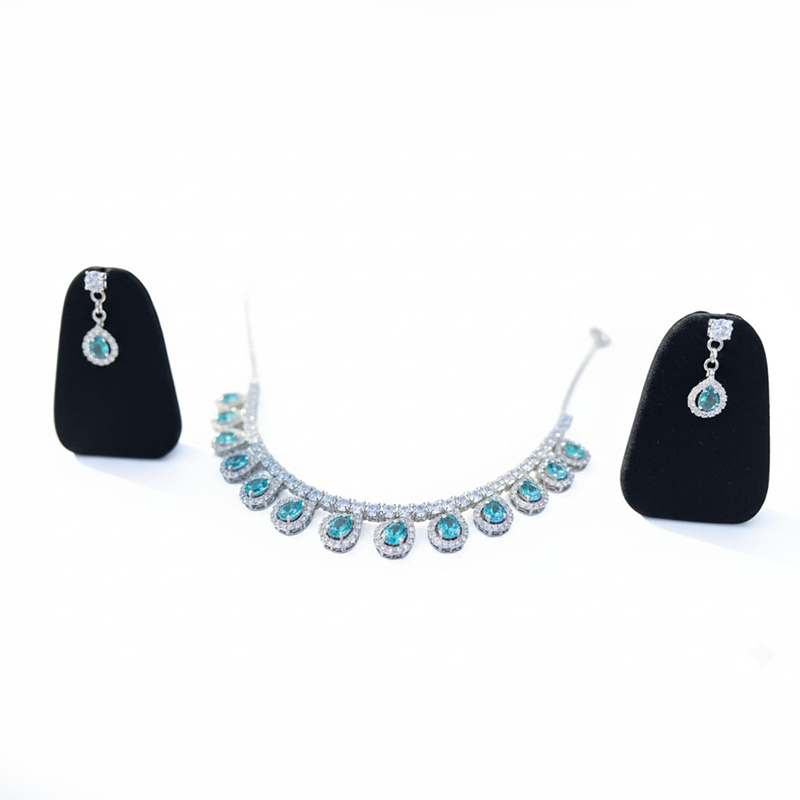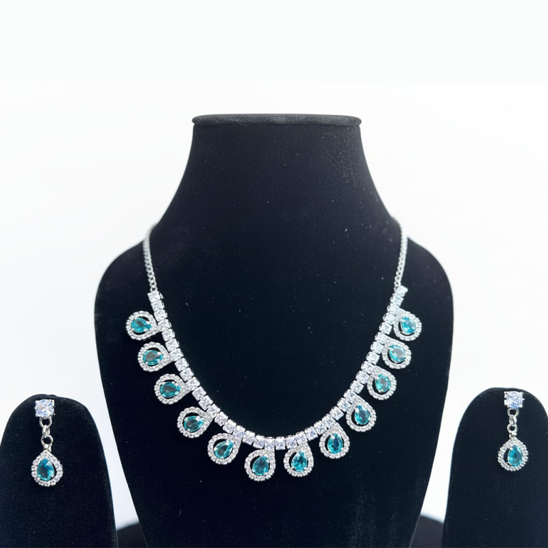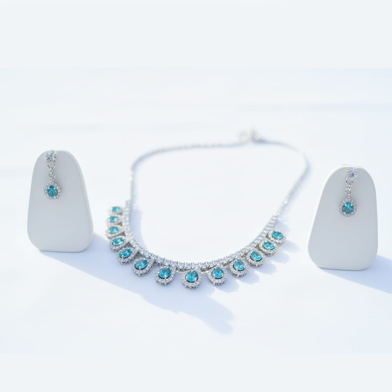 Elegant Silver-Toned Sky-Blue Diamond Metal Necklace & Earring Set