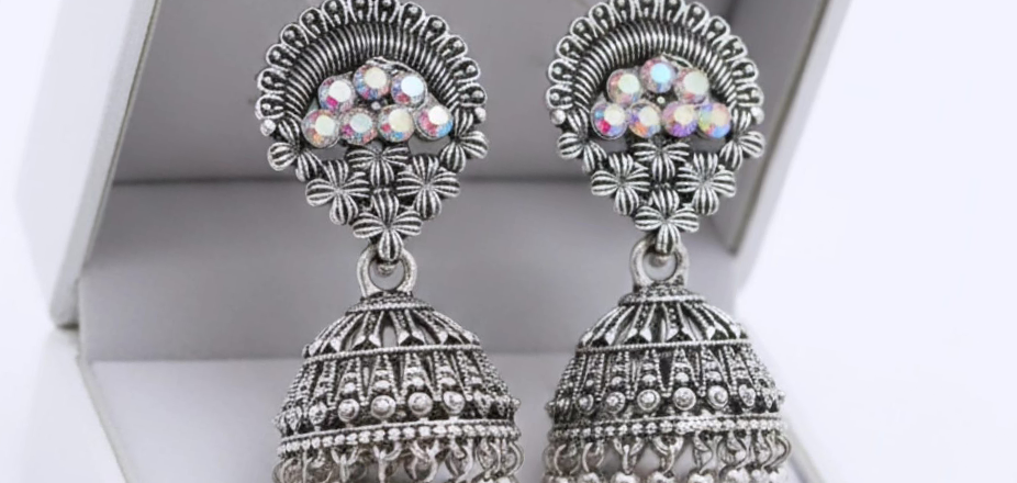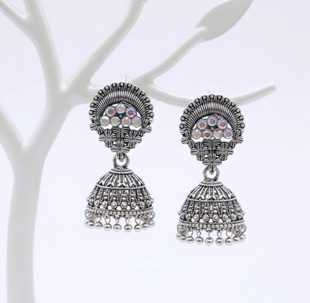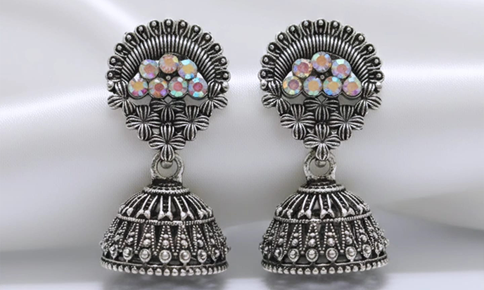 Elegant Jhumka-style, oxidized silver finish earrings