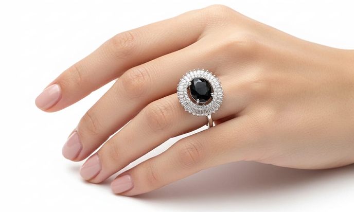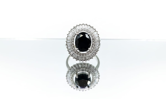 Elevate your style with this stunning American diamond ring, designed to make a bold yet sophisticated statement. At its heart sits a large, oval-cut stone in a deep, glossy black hue, capturing light with every movement and adding an air of mystery and elegance. The striking centerpiece is surrounded by brilliant American diamonds that enhance its radiance, offering a luxurious sparkle without overwhelming the design.