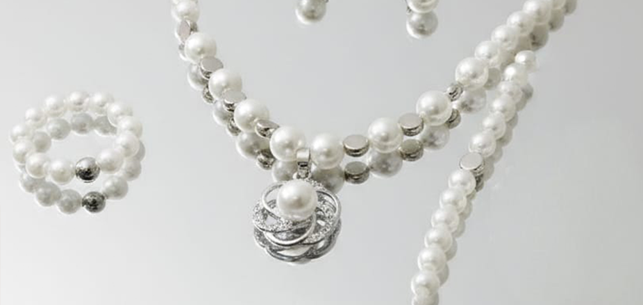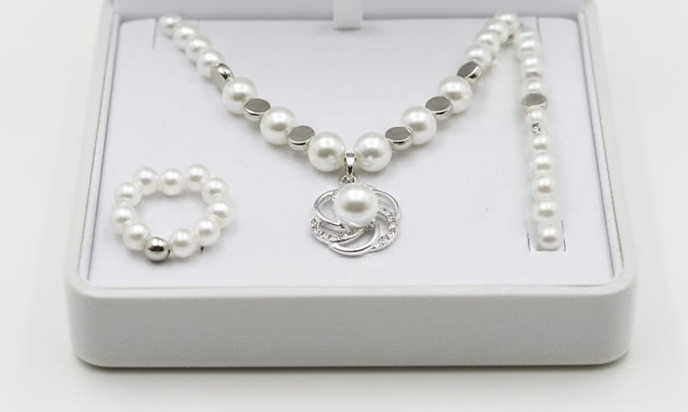 Elegant Pearl necklace with bracelet, ring, silver toned set