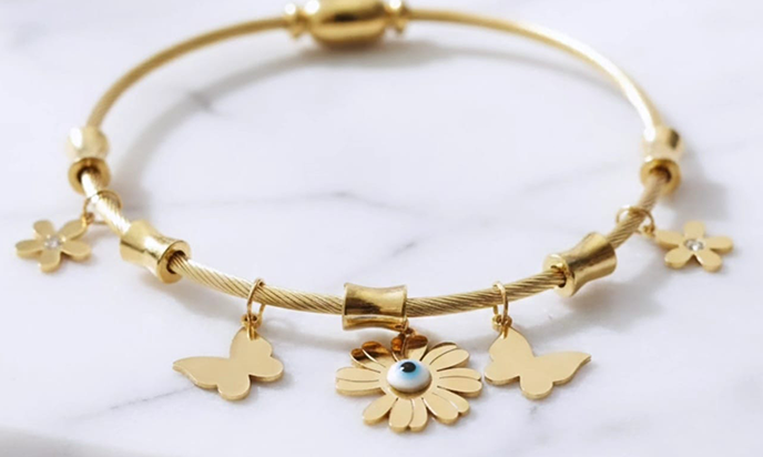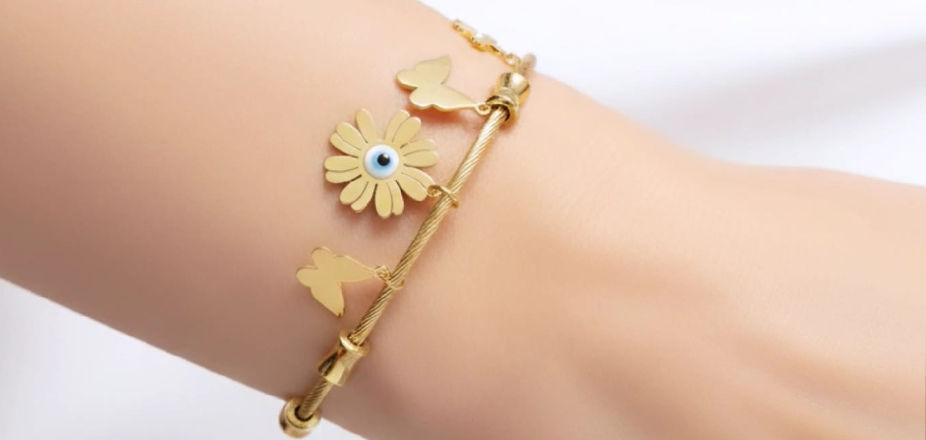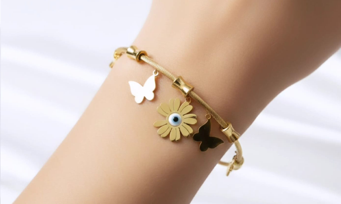 Be the first to review “Stunning twisted cable wire,Butterflies,Flowers, Evil Eye design anti tarnish bracelet” Cancel reply