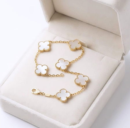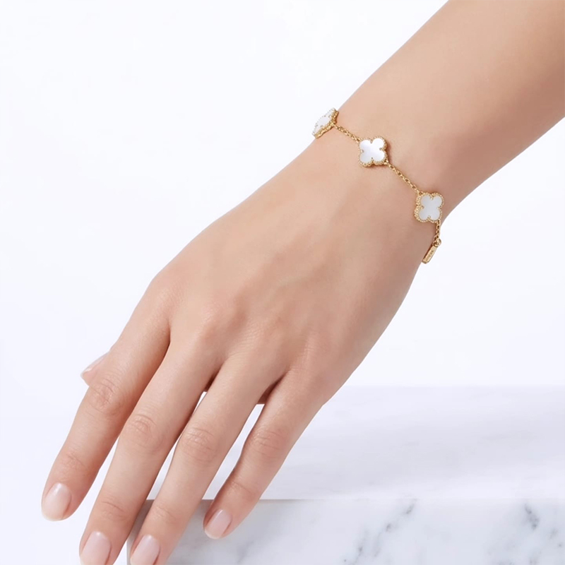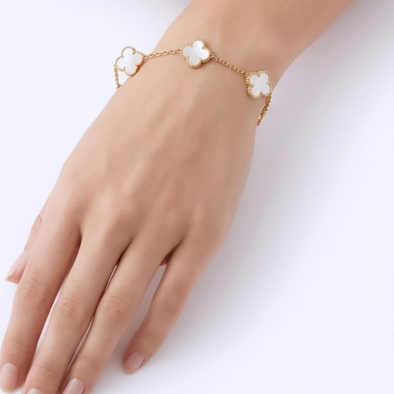 This exquisite bracelet draws inspiration from the timeless elegance of the Van Cleef & Arpels Alhambra collection. Known for its signature clover motif, this design represents luck, love, and harmony—making it both meaningful and stylish.
