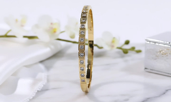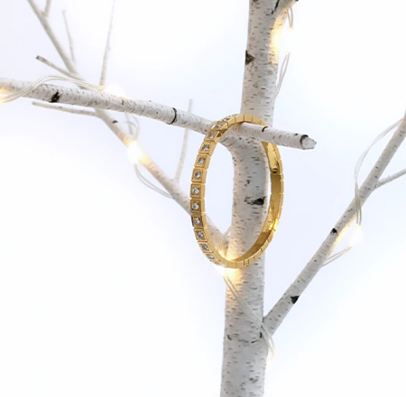 • Designed in a radiant gold-toned polish, the bangle exudes warmth and richness. The smooth metallic surface complements the brilliance of the square-cut stones, creating a balanced and eye-catching look. Its luminous shine adds a touch of luxury to both subtle and glamorous styling