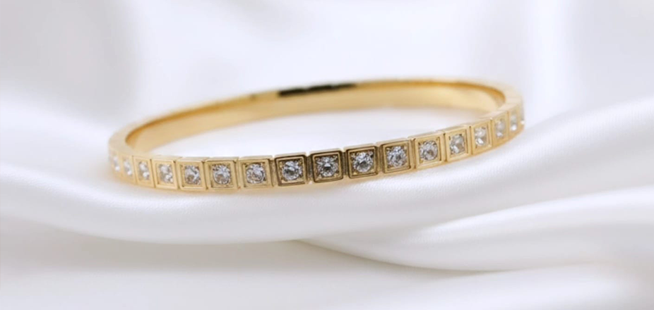 This exquisite bangle bracelet is adorned with precisely crafted square-cut stones that reflect light beautifully from every angle. The clean, symmetrical cuts create a refined and sophisticated sparkle, offering a perfect blend of modern geometry and timeless charm.The structured stone setting enhances the bracelet’s graceful appeal, making it a true statement of elegance